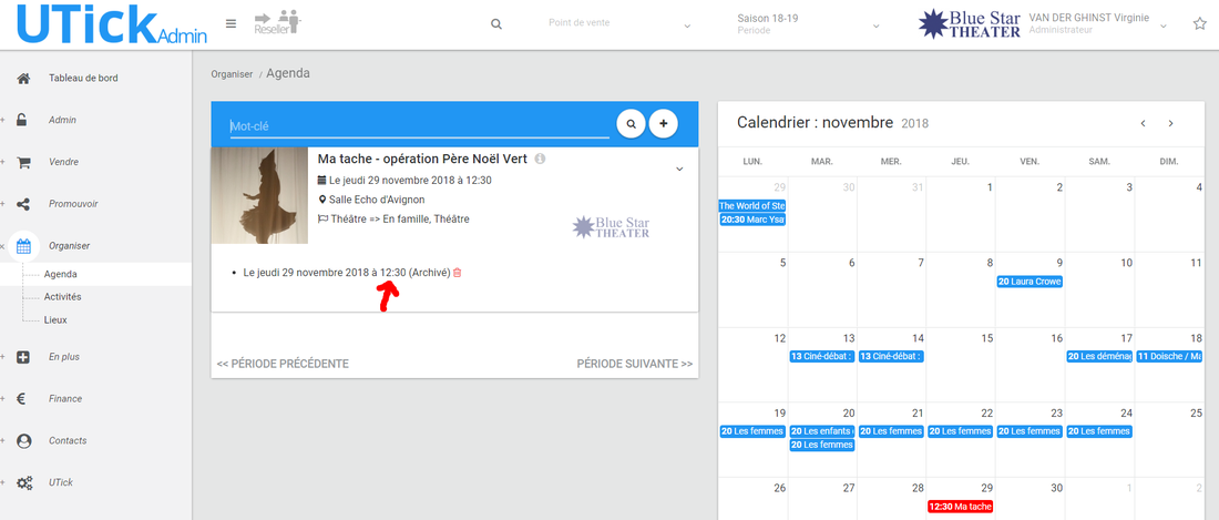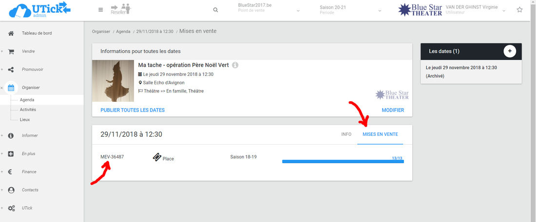1° Remettre des places disponibles dans le contingent archivé. Rendez-vous dans votre contingent archivé via Organiser > Agenda. Ensuite cherchez votre contingent soit à l'aide du calendrier à droite soit en tapant le nom dans la barre de recherche bleue. Une fois retrouvée, cliquez dessus pour entrer dedans.image.png 208.57 KBCliquez sur l'onglet "MISE EN VENTE" et ensuite sur "MEV-XXXXX".