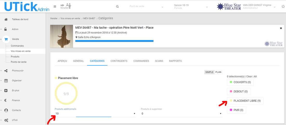 Vous arrivez sur l'aperçu de votre spectacle. Sélectionnez l'onglet "CATEGORIES". Que vous soyez en mode "SIMPLE" ou en mode "PLAN", indiquez le nombre de places à ajouter dans votre mise en vente dans le menu déroulant "produits additionnels" et sélectionnez à droite la catégorie de produit ad hoc.image.png 202.45 KBVous allez désormais pouvoir prendre votre commande.
