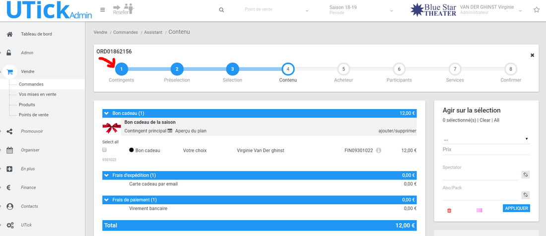 2b° Dans une commande existante Entrez dans la commande dans laquelle vous désirez ajouter des places pour ce spectacle archivé. Cliquez sur "Modifier la commande". Dans l'assistant de modification qui s'est alors ouvert, cliquez sur "1 - Contingents".image.png 177.13 KBSélectionnez le type de produit "Places", ensuite, dans la barre de recherche, tapez l'intitulé du spectacle (au moins 1 mot). Apparaîtront alors tous vos spectacles avec cet intitulé (ou ce mot). Sélectionnez le spectacle archivé et continuez votre commande comme d'habitude. Il n'est pas nécessaire de refaire toutes les étapes. Lorsque vous êtes dans "4 - Contenu", si vous êtes satisfait du contenu du panier et qu'il n'y a pas de modification au niveau du contact, des méthodes de paiements et de livraison, vous pouvez d'ores et déjà cliquer sur la petite croix en haut à droite.