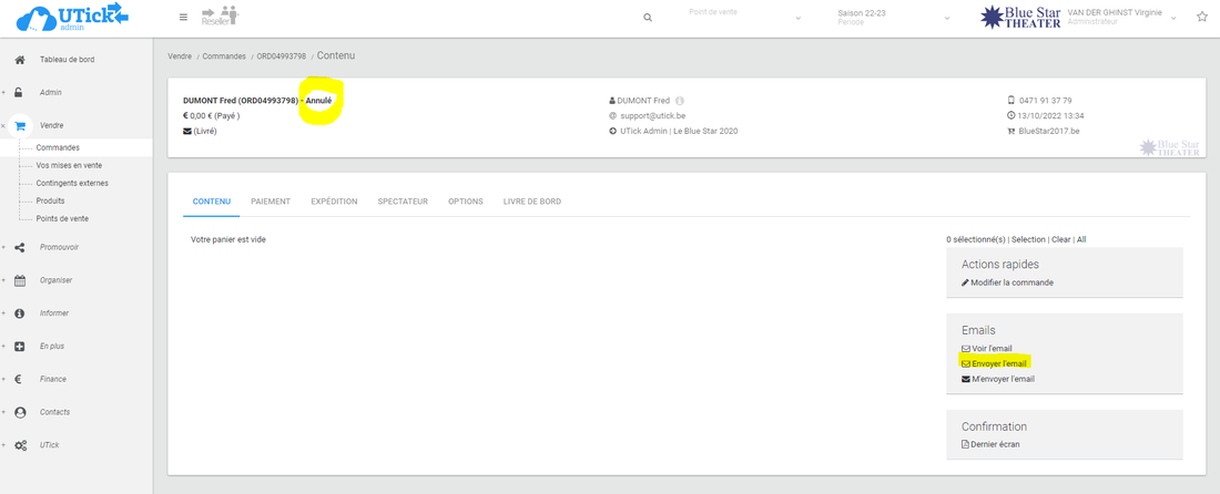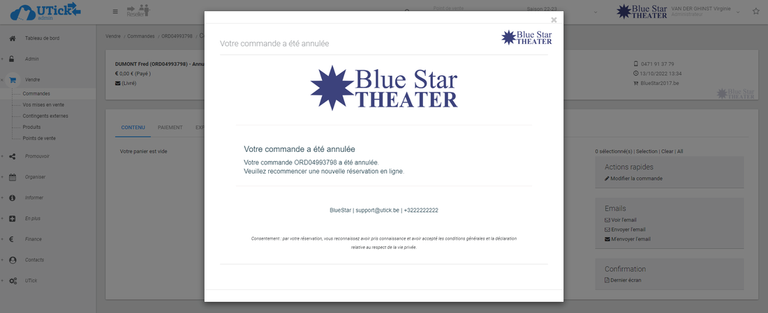 Si vous le souhaitez, vous pouvez avertir le spectateur que sa commande a été annulée en cliquant sur "Envoyer l'email".