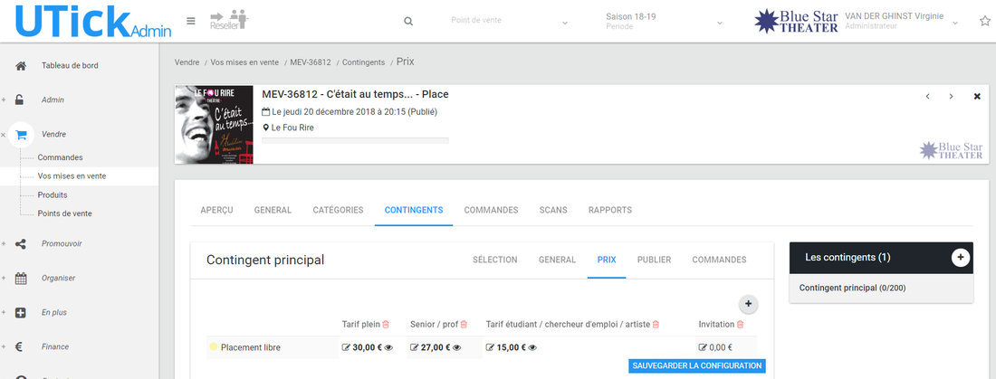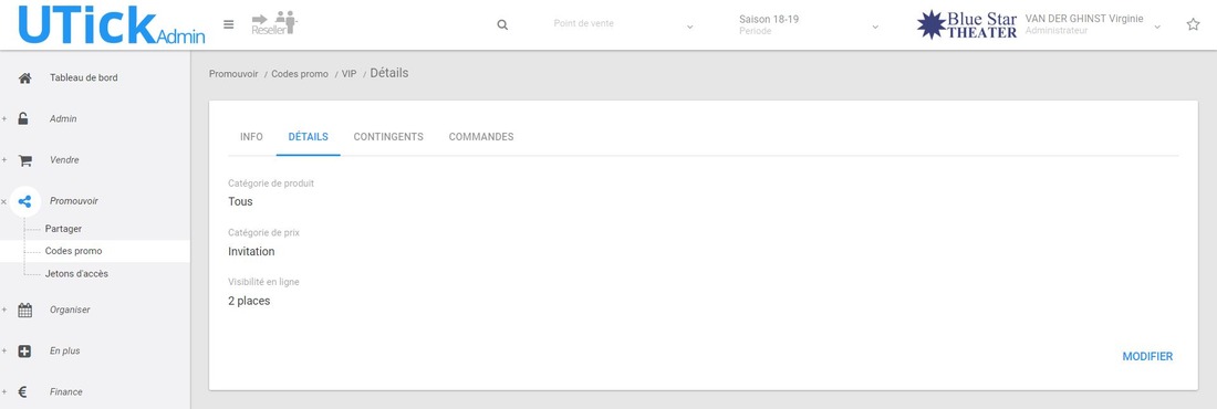 Pour que le prix apparaisse au moment où le spectateur encode le code promo, il faut que la catégorie de produit et de prix sélectionnés dans la configuration du code promo soit bien présent dans la configuration de prix de chaque mise en vente sur lequel le code promo doit fonctionner. Néanmoins, il doit être présent mais "invisible en ligne". Pour vérifier cela, rendez-vous dans Vendre > Vos mises en vente > date concernée > CONTINGENTS > PRIX.code promo.JPG 68.71 KBimage.png 201.5 KB