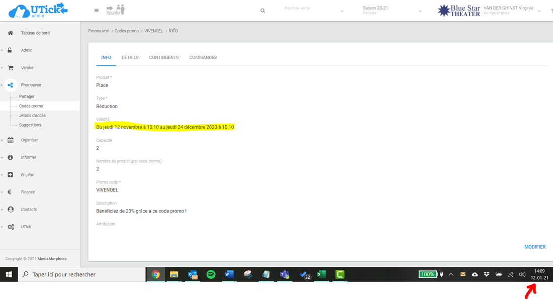 2° Soit la validité n'est pas bonne. Pour vérifier cela, rendez-vous dans Promouvoir > Code promo, sélectionnez le code promo concerné et vérifiez dans l'onglet "INFO" la validité en cours. Si la date d'aujourd'hui n'est pas incluse dans la validité, le cadre n'apparaît pas sur le shop. Pour modifier cela, cliquez sur "MODIFIER", sélectionnez la date de début et de fin de validité de votre code promo et cliquez sur "ENREGISTRER".