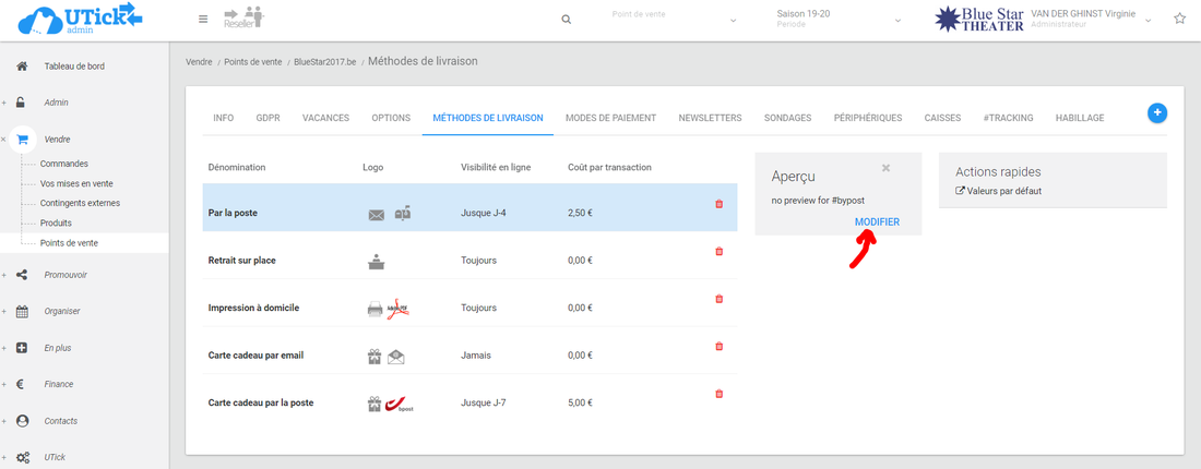Par la poste : permet au spectateur de recevoir ses tickets par la poste. Ce fonctionnement est bien sûr manuel, vous retrouverez la liste des envois à effectuer dans En plus > Envois par la poste. En cliquant sur le "V", vous indiquez que vous avez effectué l'envoi et la commande passe en statut "Clôturé".