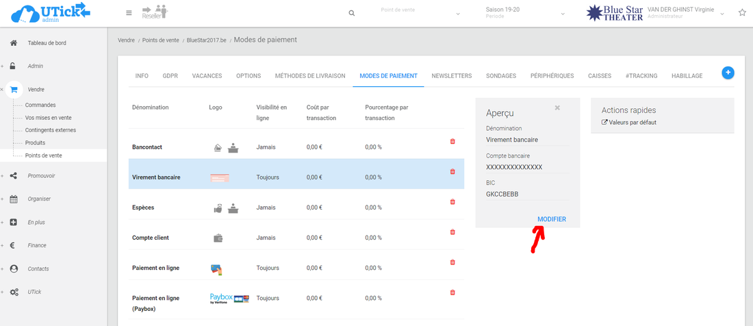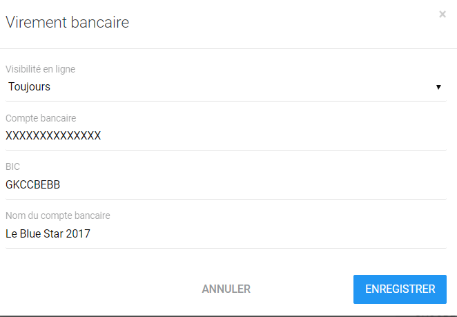 Virements bancaire : propose la possibilité de payer par virement bancaire. Le spectateur a un délai de plusieurs jours. La vérification de ce paiement se fait (semi) manuellement. C'est vous qui décidez du délai de paiement et des différentes modalités (envoi de rappel, suppression de commande, validation,...). Ce mode de paiement est gratuit.