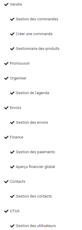 Ensuite, chaque point est rattaché aux onglets de navigation de gauche d'UTick Admin ;image.png 32.24 KBPour supprimer tout un onglet, décochez le titre afférent, cet onglet n'apparaîtra tout simplement pas dans le compte de cet utilisateur. Pour supprimer uniquement une tâche, décochez celle-ci.