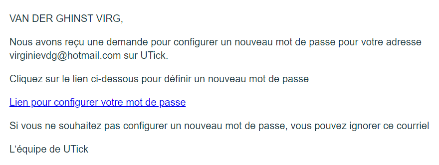 Si vous avez oublié votre mot de passe, vous avez la possibilité de demander à l'un de vos collègues ou au support UTick de vous envoyer un email vous permettant de le réinitialiser.