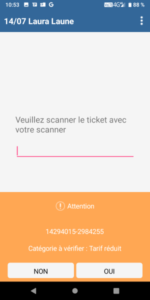 En choisissant "NON", le ticket n'est pas scanné, vous pouvez renvoyer le spectateur vers la bonne personne/entrée.
