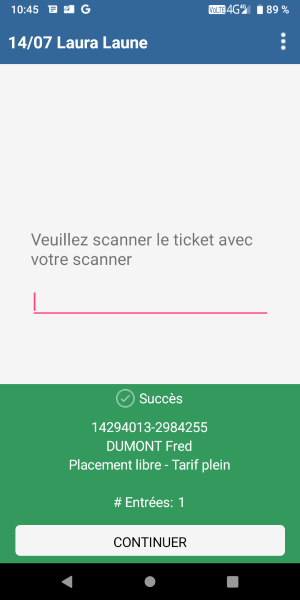 Lorsqu’un ticket est validé, un message sur fond vert apparaît : Screenshot_20220106-104547.png 25.07 KBLe ticket est accepté par le scan qui indique « Succès » et affiche les informations relatives au ticket.