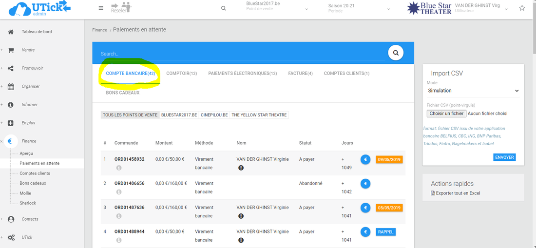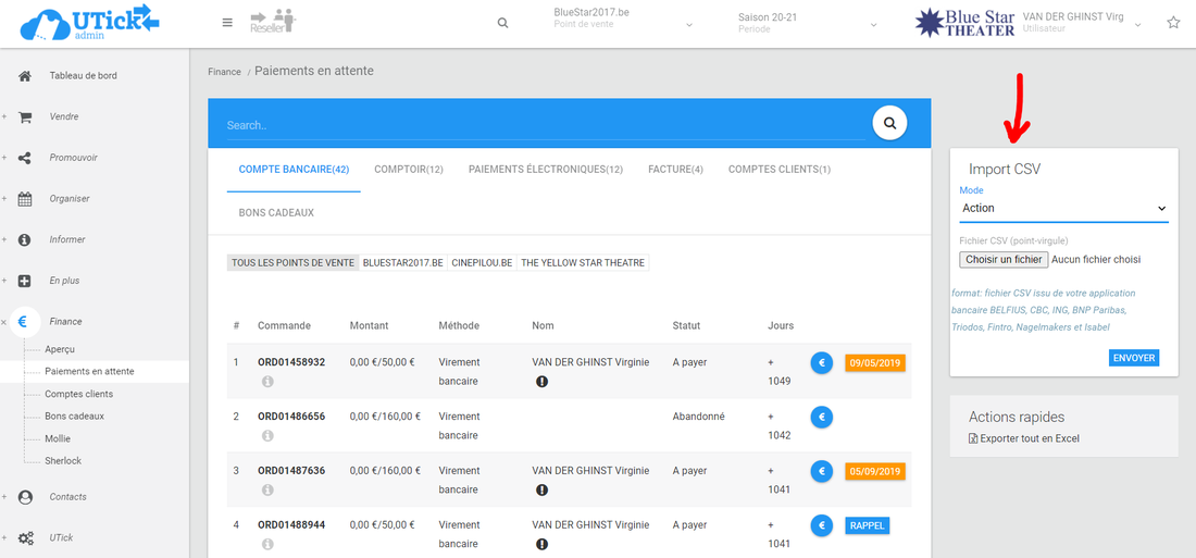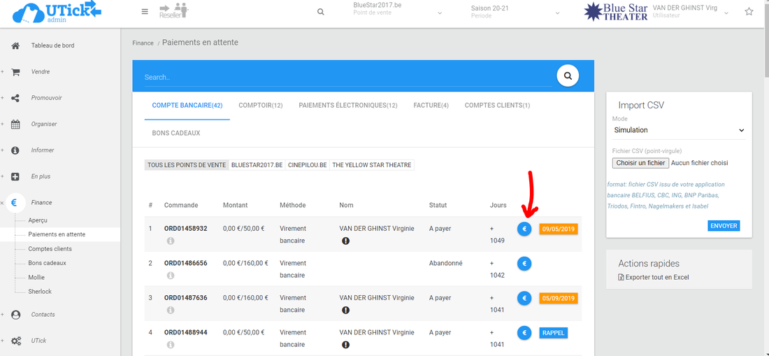Vous avez la possibilité de valider les paiements, soit par commande soit en important un fichier csv que vous pourrez obtenir sur le site de votre banque.