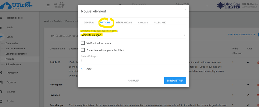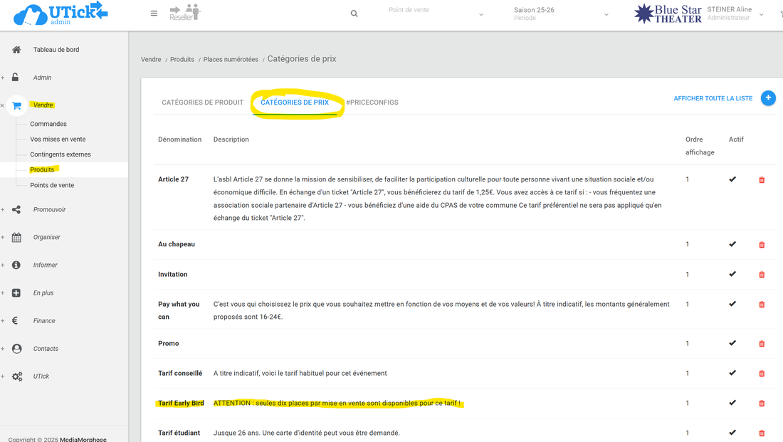 1° Sous Vendre>Produits>Places (ou places numérotées), onglet "CATÉGORIES DE PRIX", vous créez la catégorie de prix souhaitée :
