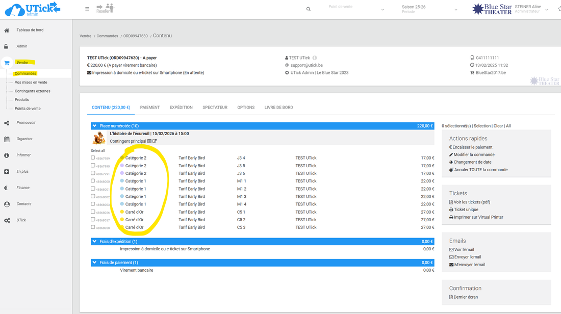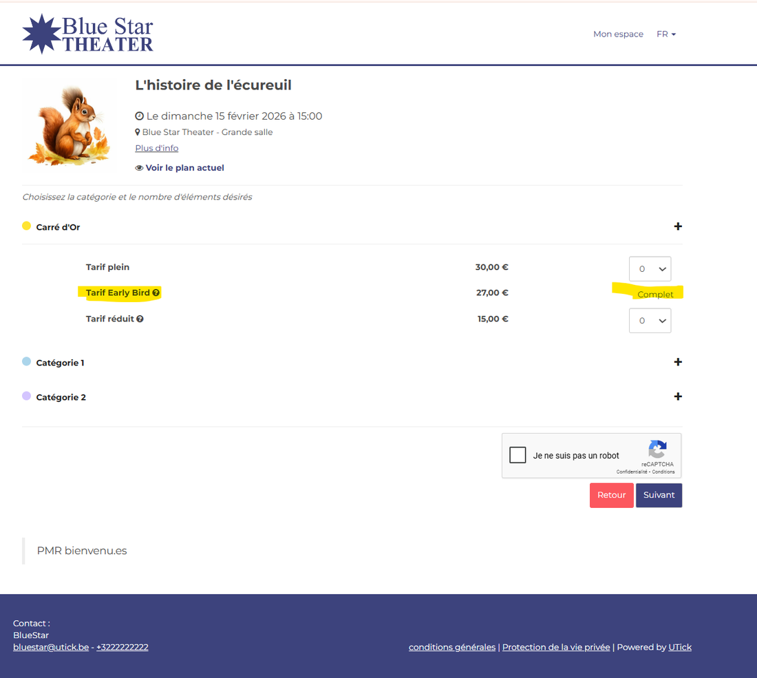 Ici, on peut encore réserver des places "Carré or" au tarif plein ou au tarif réduit, mais le tarif "Early Bird" n'est plus disponible car les 10 places ont été vendues.