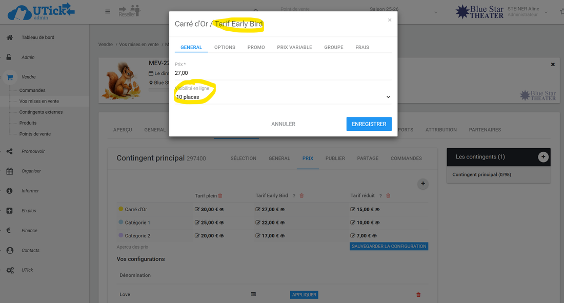 2° Dans votre mise en vente, vous ajoutez cette catégorie de prix (Si vous ne l'avez pas fait lors de la création de la mise en vente, rendez-vous sous Vendre>Vos mises en ventes>La mise en vente concernée, puis onglet "CONTINGENTS" et "PRIX") et vous configurez sa visibilité en ligne sur le nombre de places maximum que vous voulez rendre disponibles pour ce tarif :