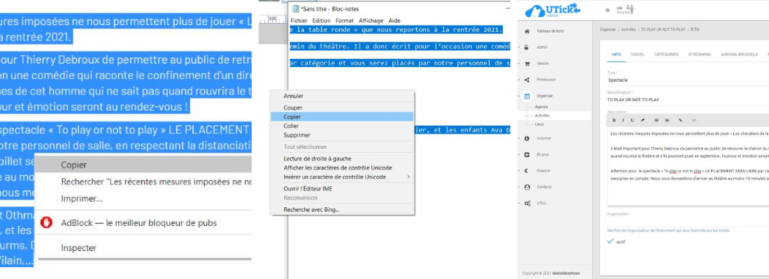 Lorsque vous devez indiquer un texte dans UTick (description, mail "préparer votre venue",...) et que vous souhaitez le copier / coller d'un texte déjà existant, il est fortement conseillé de procéder de la manière suivante ;