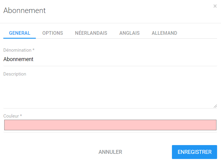 Si vous avez activé la fonctionnalité "Multilingue", vous avez la possibilité de mettre la dénomination et l'éventuelle description dans les langues ad hoc.