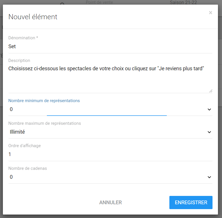 Indiquez le nombre minimum que votre spectateur devra sélectionner en ligne. S'il peut acheter un abonnement vide et revenir plus tard pour choisir les spectacles, indiquez "0".