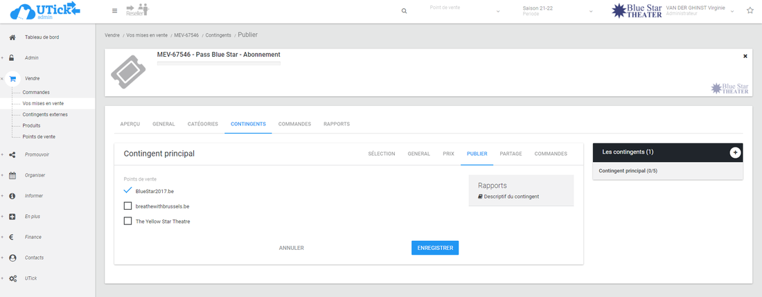 Si vous voulez oubliez sur votre shop cet abonnement PLUS TARD, vous vous rendrez au moment opportun dans Vendre > Vos mises en vente et cliquerez sur l'onglet "Abonnements" et ensuite sur le Titre de cet abonnement. Vous irez sous l'onglet "Contingents" et ensuite "Publier". Là, vous cliquerez sur "MODIFIER" et pourrez cocher le ou les points de vente sur lesquels vous souhaitez que la mise en vente soit publiée. Et enfin, vous cliquerez sur "ENREGISTRER".