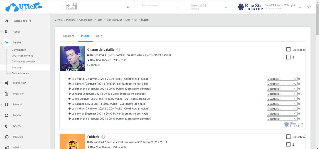 Dans tous les cas (que le spectacle soit obligatoire ou non) : dans le cadre à droite de la date, sélectionnez la catégorie de place que le spectateur pourra avoir. Vous avez deux options ;