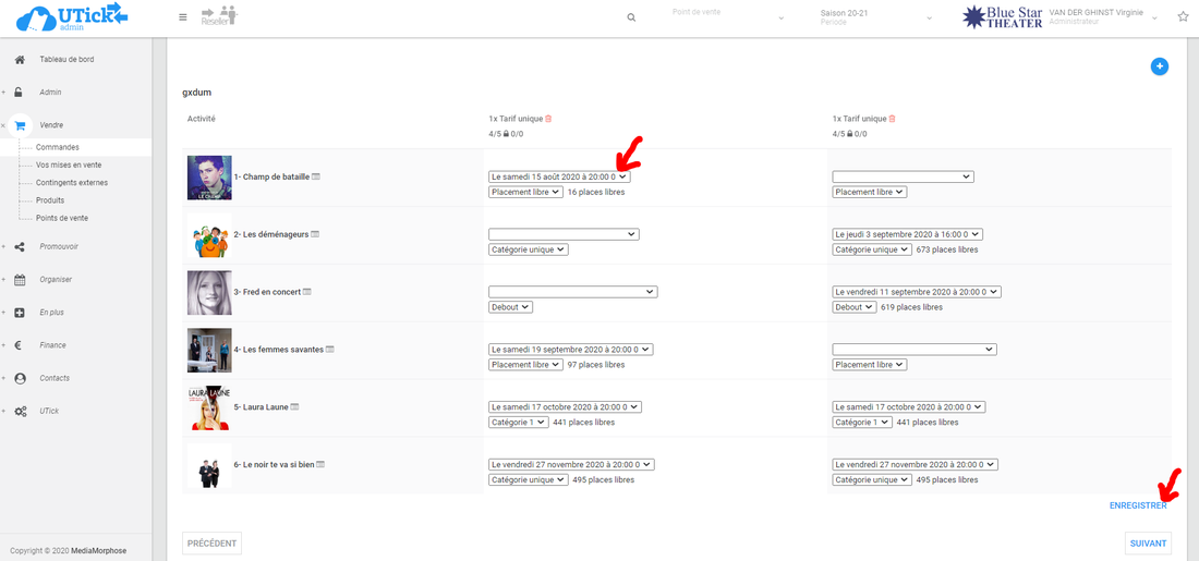 Vous avez maintenant la possibilité de cliquez une nouvelle fois sur le "+" pour ajouter à votre commande un abonnement dont la configuration diffère du premier abonnement déjà présent dans votre panier. Vous obtenez alors autant de colonne que d'abonnement dans votre panier.image.png 182.25 KBPour ajouter un spectacle à votre abonnement, indiquez-le via la dropdown se situant sur la même ligne, et ce en fonction des abonnements :image.png 219.11 KBUne fois que vous avez indiquez toutes les dates pour chaque abonnement, cliquez sur "ENREGISTRER" en bas à droite.