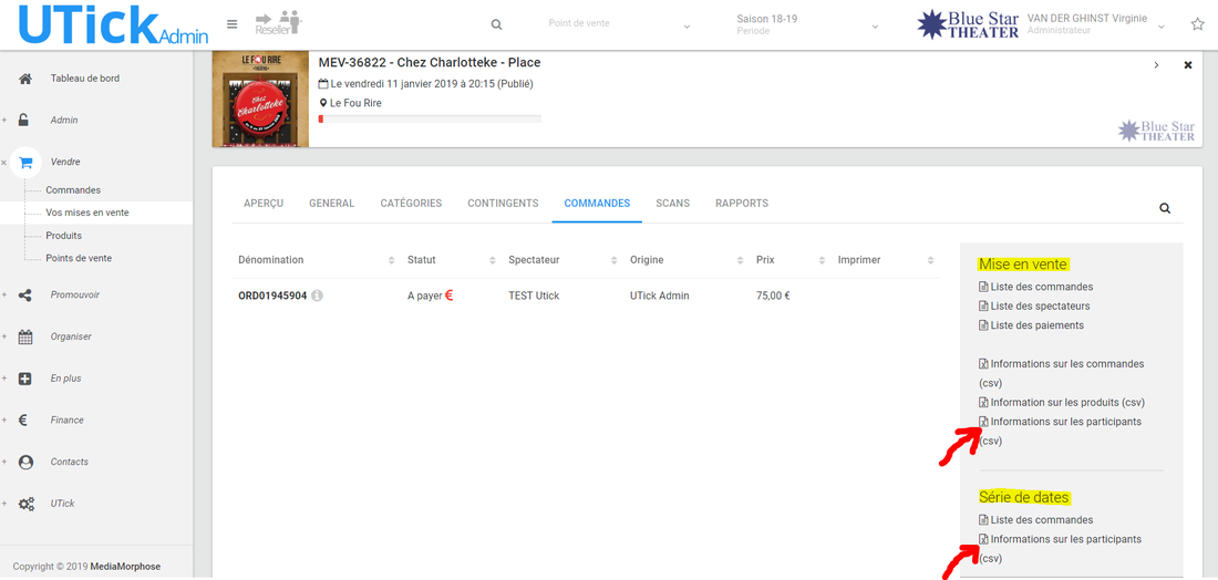 A droite, il y a un cadre gris, subdivisé en 2 parties : « Mise en vente » et « Série de dates ». Pour avoir la liste des spectateurs de cette date-là, cliquez sur "Information sur les participants" sous "Mise en vente". Pour avoir la liste des spectateurs de la série, cliquez sur « Information sur les participants » sous « Séries de dates ». Se télécharge alors un fichier Excel avec les informations des participants pour pour cette date ou cette série.