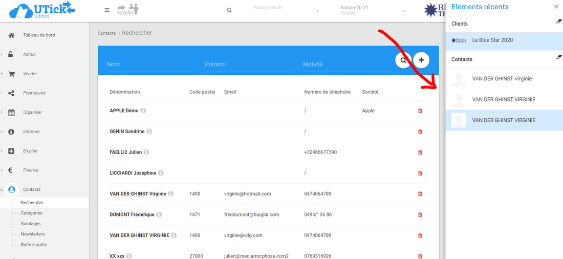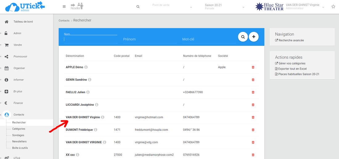 Via Contacts > Rechercher par exemple, entrez dans chaque fiche spectateur en cliquant dessus.