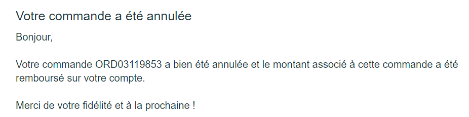 Néanmoins, il existe un email d'annulation lorsque votre commande est en statut "Annulé". Il est possible de modifier son contenu pour qu’il corresponde à la réalité (actuelle).