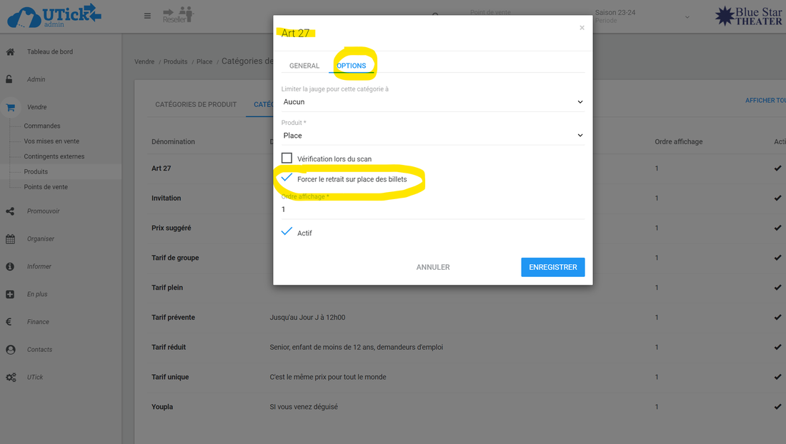Cliquez sur le tarif concerné et dans l'onglet "OPTIONS" cochez la case "Forcer le retrait sur place des billets":