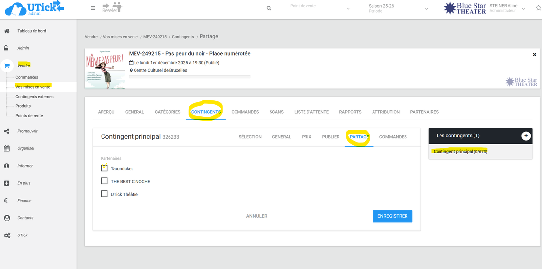 Ce partage peut se faire soit sur une partie du contingent (voir à ce propos notre FAQ "Comment mettre en place des contingents secondaires") soit sur tout le contingent. Votre partenaire et vous aurez alors l'accès à l'intégralité de la salle et vous pourrez vendre des places indifféremment dans les deux lieux.