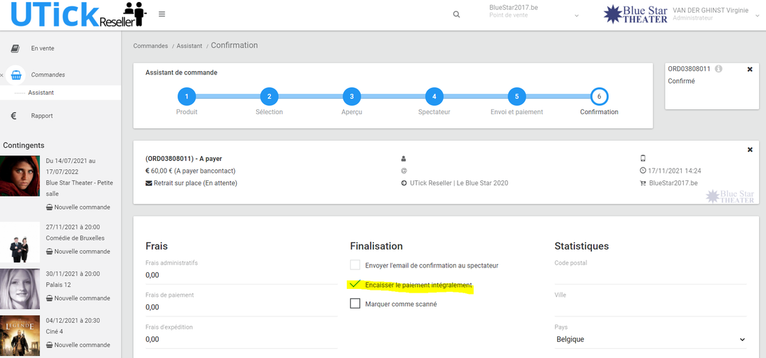 - Si la commande est bien anonyme, la coche "Envoyer l'email de confirmation au spectateur" est décochée.